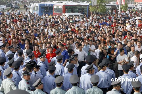 五月十三日,中超联赛第十轮河南主场在河南郑州举行,河南四五老窖队对辽宁葫芦岛港队。比赛0:1河南四五老窖队负于辽宁葫芦岛港队。一批对裁判不满的球迷,吵嚷着要见裁判李玉红。中新社发 慎重 摄