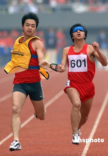 5月14日,第七届全国残疾人运动会田径比赛在云南昆明举行,其中男子100比赛按照医学分级共有12个级别,图为参加男子T11级100米比赛的福建选手许小铭与领跑员一起冲向终点。中新社发 张宇 摄