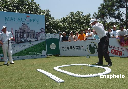 五月十六日,曾夺得亚巡赛比杆赛冠军中国的张连伟在澳门高尔夫球乡村俱乐部球场开首杆,二00七澳门高尔夫球公开赛正式开始。来自三十个国家和地区的一百四十九名运动员参赛。本届比赛正值澳门高尔夫球公开赛十周年华诞。 中新社发 史利 摄