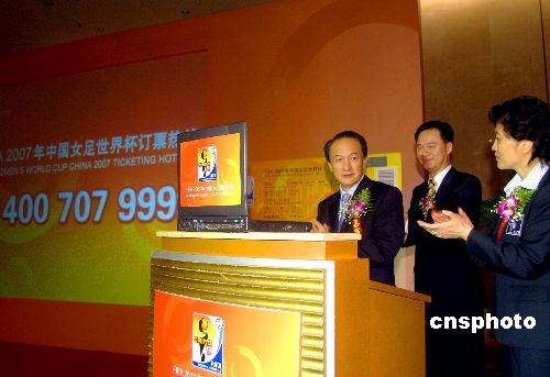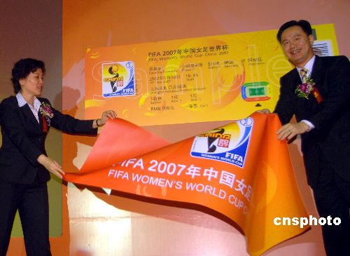 5月22日,07女足世界杯中国组委会在北京召开FIFA 2007年中国女足世界杯票务销售启动新闻发布会,官方启动票务销售工作,公布门票票样和票务热线号码4007079999。中新社发 廖攀 摄