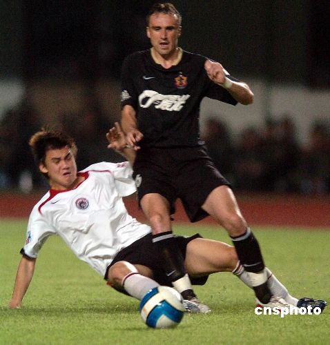 2007年5月26日晚,中超联赛进入第12轮角逐,主场作战的深圳上清饮队在深圳体育场以1比2负于辽宁葫芦岛港队。图为辽宁队门将张鹭飞身救险。中新社发 吴峻 摄