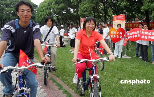 5月29日,由上海复旦、同济等四所高校的学生和足球运动员、裁判员、新闻记者共同组成的自行车方阵,在孙雯(前排右一)的带领下,通过自行车骑游校园的方式宣传女足世界杯,从而拉开07女足世界杯倒计时100天系列活动的序幕。中新社发 汤彦俊 摄