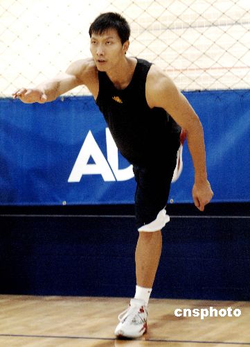 中国篮球新星易建联六月五日在洛杉矶卡森体育馆首次面对中美媒体亮相,苦练基本功备战NBA六月选秀。中新社发 贾国荣 摄