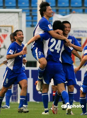 6月13日,2007年A3联赛进入最后一轮,上海申花在济南迎战浦和红宝石。最终申花以3:1完胜浦和,报了亚冠一剑之仇。在此后的比赛中鲁能1:2负于城南一和,这样,上海申花以净胜球优势夺得今年A3冠军。中新社发 周青先 摄