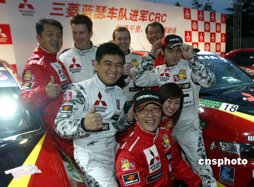 2007年全国汽车拉力锦标赛第二站6月15日至17日在北京怀柔区举行,中国东南汽车与万宇汽车俱乐部借此机会正式签约成立“三菱蓝瑟车队”参加本站比赛,著名影星林志颖现场助阵与队友合影留念。中新社发 赵振清 摄