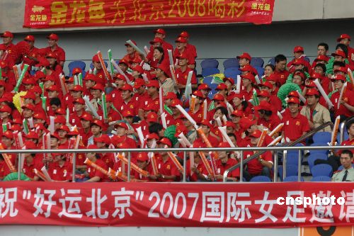 7月1日,北京奥运会四国女足测试赛在秦皇岛敲响战鼓。本次测试赛定于二00七年七月一日至十日分别在秦皇岛和沈阳举行,中国、意大利、墨西哥、泰国四支女足队伍参赛。作为二00八年北京奥运会足球比赛之前唯一的一次测试,本次测试赛将完全按照北京奥组委要求,对比赛运行模式、组织结构和各系统运行等方面进行检测。图为观众观看比赛,热情高涨,喝彩不断。中新社发 王宝德 摄