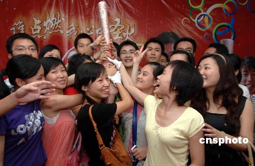 七月三日,北京奥运火炬“祥云”抵福建,这是奥运火炬有史以来首次来到福建,大受榕城市民欢迎。中新社发 王东明 摄