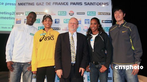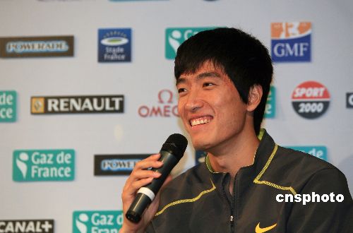 即将参加7月6日在欧洲黄金联赛巴黎赛站比赛的中国田径运动员刘翔,7月3日出现在巴黎法兰西体育场,并接受中外记者采访。中新社发 钟诚 摄