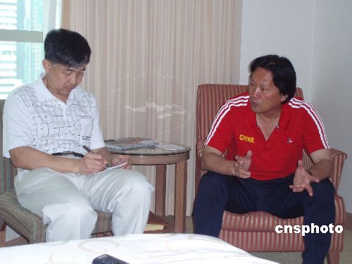 七月六日,中国足球队主教练朱广沪在吉隆坡王子酒店向中新社记者披露亚洲杯用兵之道。中新社发 苏祥新 摄