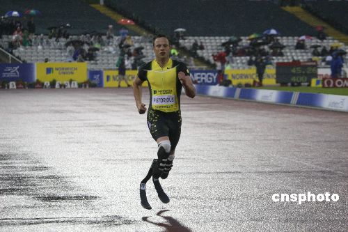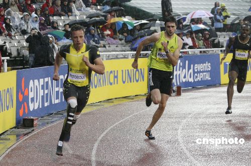 当地时间七月十五日晚,南非残疾运动员“无腿飞人”奥斯卡·皮拉特,在谢菲尔德参加健全人参赛的英国田径大奖赛四百米比赛,遗憾地获得最后一名。奥斯卡·皮拉特斯自幼双腿截肢,安装假肢后的奥斯卡屡破残疾人比赛世界纪录,但他希望作为普通运动员参加北京奥运会。中新社发 李鹏 摄