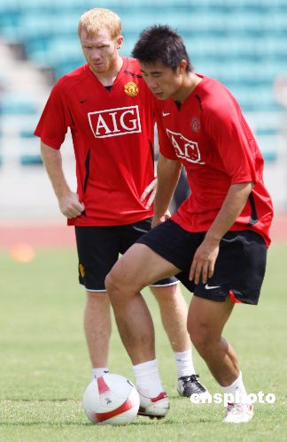 7月22日上午,到澳门访问的英格兰足球超级联赛劲旅曼联队在澳门体育场冒着近40摄氏度的高温训练。代表中国国家队参加亚洲杯后归来的中国小将董方卓也投入球队训练中训练。根据主教练弗格森的安排,23日对阵中国深圳队的比赛董方卓将做为前锋首发。中新社发 任晨鸣 摄