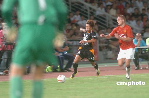 七月二十三日晚,英超班霸曼联在澳门运动场强势登场,与深圳上清饮进行第三场亚洲之旅友谊赛。深圳上清饮实力不济,顽强拼搏,虽败犹荣,精神可嘉。中新社发 史利 摄