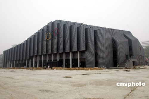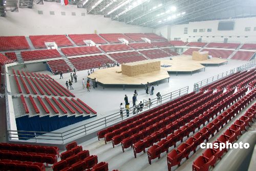 7月26日,座落于中国农业大学东校区的2008北京奥运会摔跤比赛馆进入收尾阶段。该工程占地面积13900平方米,总建筑面积23950平方米,计划总投资估算1.325亿元。体育馆结构形式为门式钢架结构,设计座席8000个,其中固定座席6000个,内场地设有3个摔跤比赛垫,副馆为运动员休息、训练等用房。奥运会后该体育馆将成为学校的室内综合体育馆。中新社发 杜洋 摄