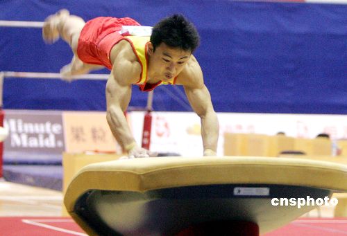 7月29日,在上海长宁体操中心进行的2007年体操世界杯中国站男子跳马的比赛中,中国选手冯喆发挥出色,以16点187分和拉托维亚选手萨夫洛年科并列冠军。图为冯喆在比赛中。中新社发 汤彦俊 摄