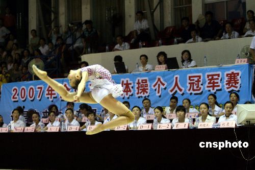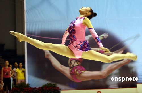 7月31日,艺术体操选手在全国艺术体操个人冠军赛决赛中表演。当晚,全国艺术体操个人冠军赛在河南许昌结束,经过3天的比拼,14个冠军各有其主。广东队包揽了少年团体和成年团体“双金”,辽宁队的窦宝宝与浙江队的梁雨婷分获少年全能冠军、成人全能冠军,在少年单项决赛中,辽宁队的窦宝宝夺得圈、棒、球操项目的3枚金牌。中新社发 牛书培 摄