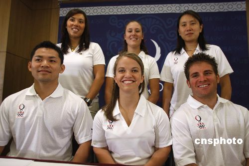 8月2日,为庆祝北京奥运会倒计时一周年,应中国奥委会邀请,美国奥委会组织6名“奥运之星”对北京进行“友好之旅”访问,其中4名具有中国血统,包括原中国乒乓球国手高军。图为出席“友好之旅”新闻发布会的美国运动员合影,前排左起白国豪、艾琳、唐尼;后排左起田昕、林赛、高军。中新社发 杜洋 摄