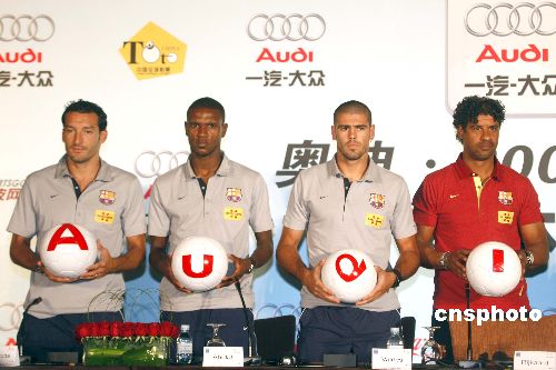 八月三日,“奥迪·2007巴萨中国行”组委会在北京举行了新闻发布会,巴萨主教练里杰卡尔德率领爱将赞布罗塔和巴尔德斯以及新援阿比代尔出席,北京国安主教练李章洙也出席了发布会。中新社发 盛佳鹏 摄