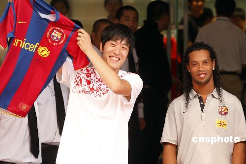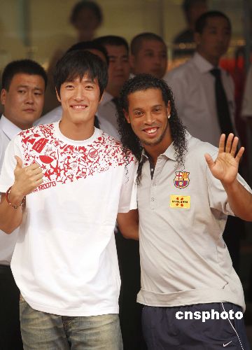 八月三日,中国飞人刘翔和两届世界足球先生罗纳尔迪尼奥共同出现在北京王府井,出席耐克中国首家自营旗舰店的开幕仪式。中新社发 盛佳鹏 摄