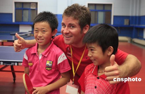 8月3日,美国奥委会奥运之星“友好之旅”访华团一行到北京什刹海体校访问,并与少年选手互动交流。为庆祝北京奥运会倒计时一周年,应中国奥委会邀请,美国奥委会率6名奥运之星运动员到北京进行友好访问,其中4名具有中国血统,包括原中国乒乓球国手高军。图为美国著名小轮自行车运动员唐尼·罗宾逊与北京乒乓球小选手合影。中新社发 杜洋 摄