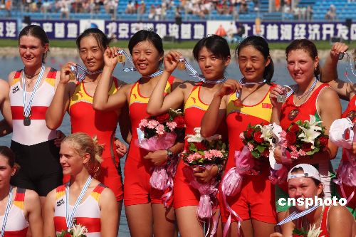 8月11日,在北京顺义奥林匹克水上公园举行的好运北京2007年世界青年赛艇锦标赛进入A组冠军争夺战,在率先开始的女子四人单桨比赛中,中国队夺得首枚金牌,德国队和白俄罗斯队分别获得银牌和铜牌。图为颁奖现场。中新社发 杜洋 摄