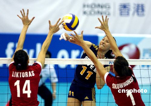 8月11日,在香港体育馆举行的“2007世界女排大奖赛”上,中国女排选手迎战世界劲旅波兰女排,结果以2比3落败。图为中国女排11号选手李娟在比赛中。中新社发 洪少葵 摄
