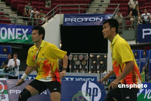 八月十六日下午,吉隆坡,羽毛球世锦赛高潮迭起,在男子双打中,东道主大马一对老将钟腾福/李万华以二比一艰难淘汰丹麦组合西蒙/安德尔斯进入八强。图为比赛中的钟腾福/李万华。中新社发 苏祥新 摄