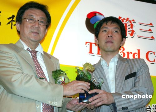 八月十七日,在第三届中环杯世界围棋锦标赛决赛中,韩国棋手李昌镐九段中盘击败另一位韩国棋手朴正祥夺冠,并获得二百万元新台币奖金。图为当晚在台北君悦大饭店举行的颁奖典礼上,台湾棋院董事长翁明显向李昌镐(右)颁发冠军奖杯。中新社发 董会峰 摄