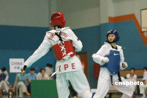 2007国际跆拳道奥运模拟赛于8月17日在北京什刹海体校拉开战幕。比赛邀请的韩国、越南、中国台北三支队伍数十位选手云集赛场。精彩激烈的首日比赛中,2006年亚运会和2007年世锦赛双料冠军吴静钰两战全胜。图为吴静钰(蓝)与中国台北选手吴燕妮对战中。中新社发 李学仕 摄