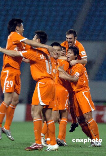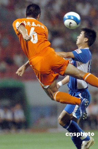8月18日,2007中国足球超级联赛在山东济南的一场比赛中,主场作战的山东鲁能泰山队以2比1战胜上海申花足球队。 中新社发 张侃 摄