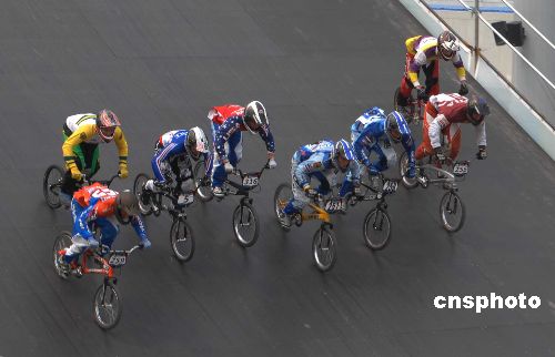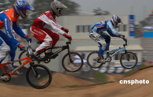 8月20日,在北京石景山区老山小轮车赛场上,参加“好运北京”2007国际自盟小轮车世界杯赛的选手们正在进行赛前热身。老山小轮车赛场占地面积1.98公倾,总建筑面积3399平方米,总座位数3396席。小轮车赛从2008北京奥运会起正式列为比赛项目。老山小轮车赛场也成为奥运会历史上第一个标准场地。中新社发 刘德斌 摄