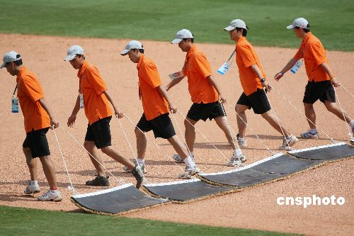2008北京奥运会测试赛之一的北京国际棒球邀请赛从8月18日至23日在北京奥运会棒球赛场——五棵松棒球场举行,按照奥运会标准选择的志愿者大多数是北京地区的在校大学生。图为志愿者8月23日冒着35摄氏度的高温在棒球场清整场地。中新社发 任晨鸣 摄