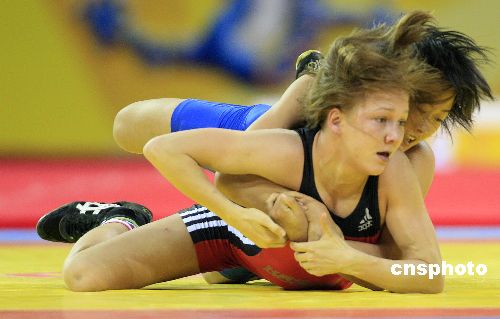 8月24日,“好运北京”2007世界青年摔跤锦标赛女子自由式摔跤55公斤级的比赛中,中国选手邱红梅(蓝)战胜俄罗斯选手KRASNOVA Ekaterina获得金牌。中新社发 杜洋 摄
