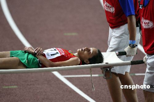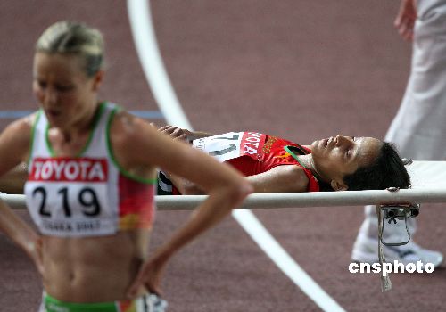八月二十五日晚,在大阪举行的第十一届世界田径锦标赛女子一万米跑比赛中,数名选手难以忍受当日闷热的天气,冲过终点便晕倒在地。中新社发 毛建军 摄