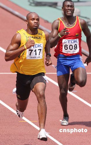 八月二十五日中午,世界纪录保持者鲍威尔在大阪第十一届世界田径锦标赛男子一百米预赛中亮相,并以十秒三四的成绩轻松进入下一轮赛事。来自牙买加的鲍威尔将在八月二十六日与美国著名选手盖伊同场PK,飞人大战一触即发。中新社发 毛建军 摄