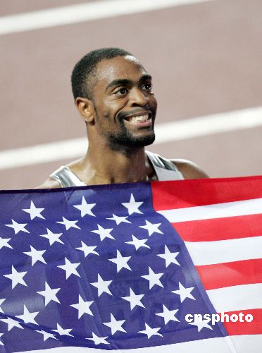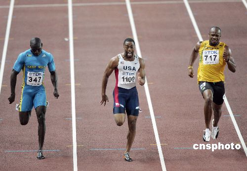 八月二十六日晚,在大阪举行的第十一届世界田径锦标赛男子百米比赛中,美国选手盖伊以九秒八五的成绩战胜世界纪录保持者鲍威尔获得冠军。中新社发 毛建军 摄