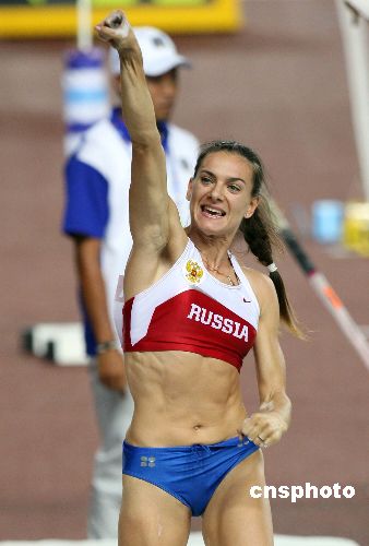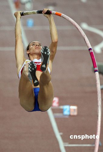 八月二十八日晚,在大阪世界田径锦标赛女子撑杆跳高比赛中,世界纪录保持者、俄罗斯选手伊辛巴耶娃以四米八零的成绩获得冠军。中新社发 毛建军 摄