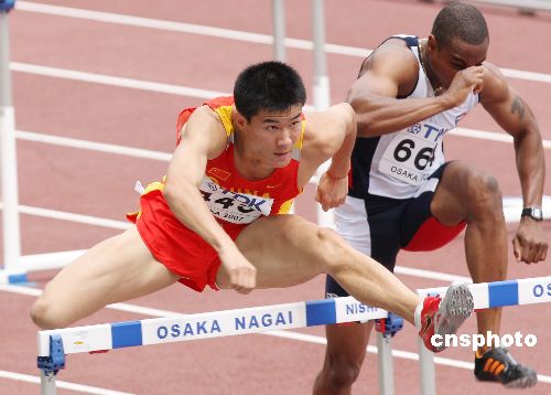 八月二十九日中午,在大阪世界田径锦标赛男子一百一十米栏预赛中,中国选手史冬鹏跑出十三秒二二的个人最好成绩,以小组第一的身份进入复赛。中新社发 毛建军 摄