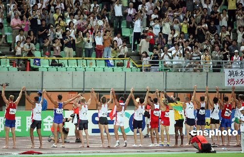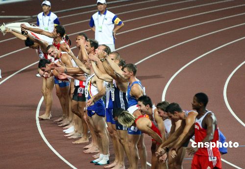 九月一日晚,在大阪举行的第十一届世界田径锦标赛男子十项全能比赛结束后,经历了二日艰苦赛事的选手们集体“谢幕”。中新社发 毛建军 摄