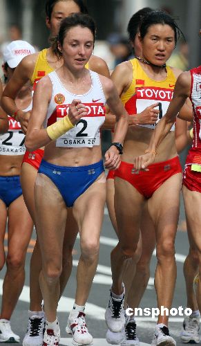 九月二日,中国著名女子马拉松选手周春秀在大阪举行的第十一届世界田径锦标赛女子马拉松比赛中以二小时三十分四十五秒的成绩获得银牌。这是继刘翔之后,中国队在本届世锦赛上获得的第二个好成绩。中新社发 毛建军 摄