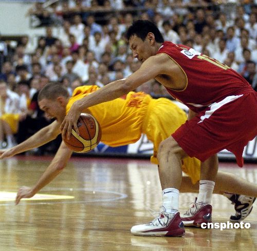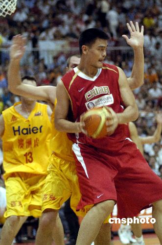9月3日晚,“新世界国际杯中澳男篮对抗赛”在广东深圳宝安体育馆鸣哨,中国男篮与来访的澳洲虎队进行较量。姚明的复出,易建联成功参加NBA选秀后首次回家作战,王治郅、朱芳雨、王仕鹏、刘炜、莫科、孙悦、李楠等重量级国手的亮相引起众人关注。主教练尤纳斯缺阵,郭士强行使代理主教练职责临场指挥比赛。终场中国男篮以69:56战胜澳洲虎队。中新社发 吴峻 摄