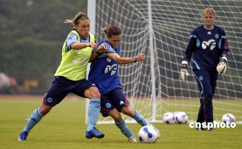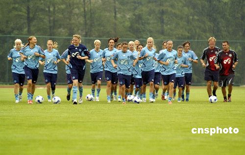 9月8日下午,女足世界杯即将开战,与中国女足分在同组的丹麦队来到武汉二桥训练基地,在主教练带领下积极备战。据悉,中国女足在世界杯小组赛上的首个对手就是丹麦队。双方在国际A级赛事中交手过11场,中国队保持着7胜3平1负的绝对领先战绩,并曾有过6:0大胜对手的辉煌战例。中新社发 吴峻 摄
