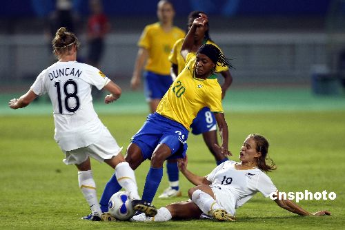 九月十二日,2007女足世界杯进入第三比赛日,在武汉体育中心进行的小组赛中,巴西队五比零大胜新西兰队。中新社发 盛佳鹏 摄