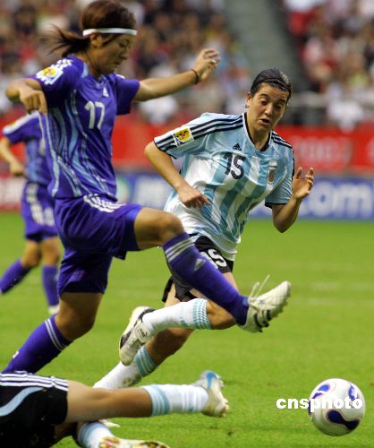 9月14日,2007年女足世界杯A组日本队与阿根廷队的比赛在上海进行。日本队17号永里优季(Yuki NAGASATO)在全场比赛进入伤停补时阶段抓住一次机会,禁区内抽射破门,凭借此球,日本队以1-0艰难战胜阿根廷,两战一胜一平积四分,暂居A组榜首,出线形势较好。图为日本队17号永里优季(Yuki NAGASATO)带球突破阿根廷队15号弗罗伦茜亚·曼德里尔(Florencia MANDRILE)的防守。中新社发 汤彦俊 摄