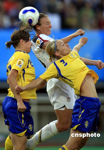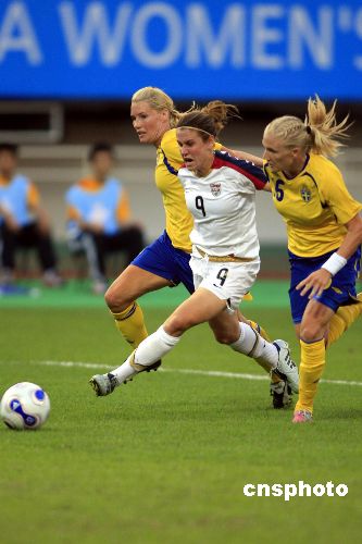 9月14日,2007年中国女足世界杯在成都体育中心开始了B组美国和瑞典的较量,凭借瓦姆巴赫的两个进球,美国女足以2比0战胜瑞典。中新社发 杜洋 摄