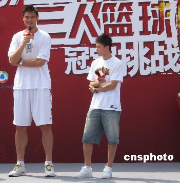 正在广东中山参加中澳男篮对抗赛的姚明,九月二十二日出现在广东中山市体育馆,出席有全国十万余名青少年篮球爱好者参加的肯德基三人篮球赛新赛季启动仪式,为赛事助威。中新社发 唐贵江 摄