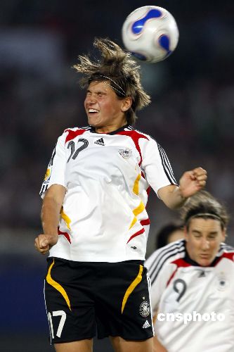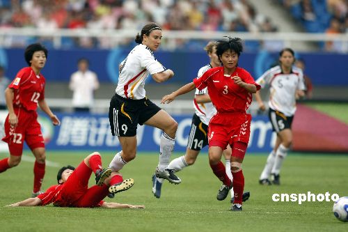 九月二十二日,2007女足世界杯四分之一决赛德国对朝鲜的比赛在武汉体育中心进行,德国队以三比零战胜朝鲜队,晋级半决赛。中新社发 盛佳鹏 摄