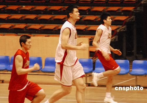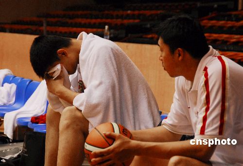 2007年9月27日上午10时许,安徽合肥,中国国家男子篮球队在结束向合肥希望小学的捐赠仪式后,就赶到安徽古井体育馆开始训练,备战中澳男篮对抗赛。王治郅由于身体不佳,一直坐在场边休息,而姚明坚持训练半个小时后即下场休息,没有再进行训练。中新社发 从启 摄