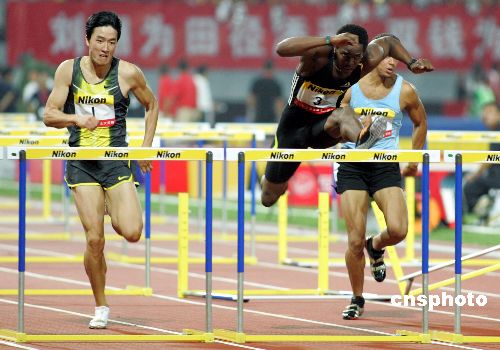 9月28日,在上海松江大学城举行的2007上海国际田径黄金大奖赛男子110m栏的比赛中,中国选手刘翔(图左)以13.21秒获得第三名,古巴小将戴龙·罗伯斯(图中)以13.01秒获得冠军。中新社发 汤彦俊 摄
