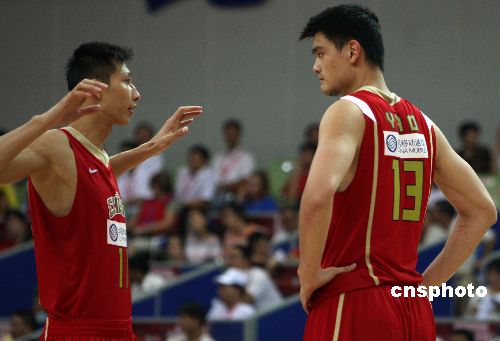 10月1日下午,2007年中欧篮球对抗赛继续在江苏省昆山市进行,姚明、易建联、王治郅等主力悉数上阵的中国男篮以77比83负于欧洲劲旅莫斯科中央陆军队,热身赛四连胜就此终结。图为姚明与易建联在比赛中探讨中国男篮的战术与存在的问题。中新社发 任晨鸣 摄