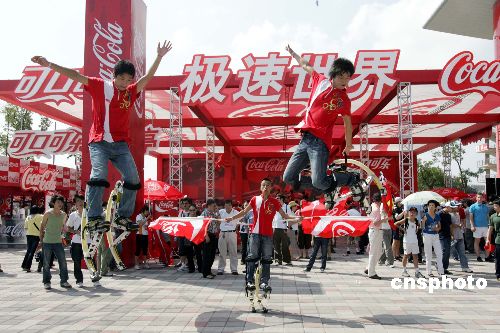 十月六日,“极限腾空”秀在上海赛车场外与F1展开比拼,吸引许多热爱极限运动的观众。“可口可乐极速世界”活动内容精彩多样,是F1赛场外的另类极限运动。中新社发 潘索菲 摄